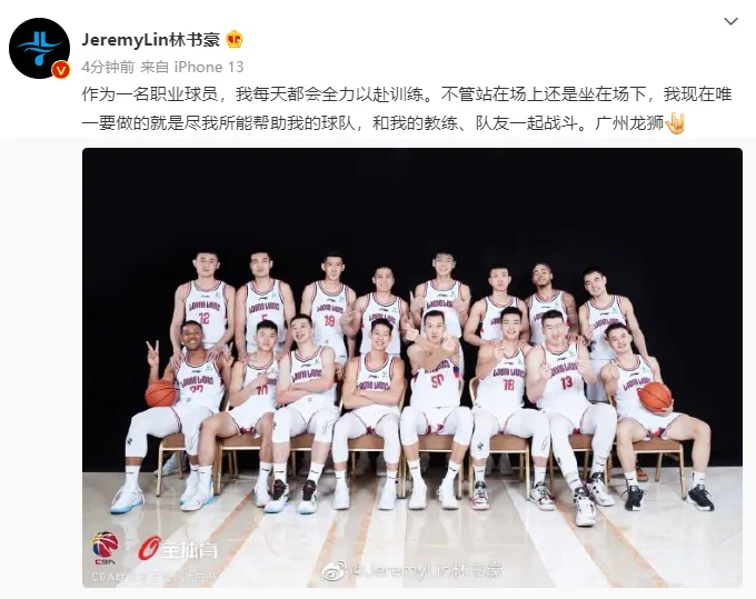 林书豪今天下午更新个人微博,他写道:“作为一名职业球员,我每天都会全力以赴训练。不管站在场上还是坐在场下,我现在唯一要做的就是尽我所能帮助我的球队,和我的教练、队友一起战斗。广州龙狮”。