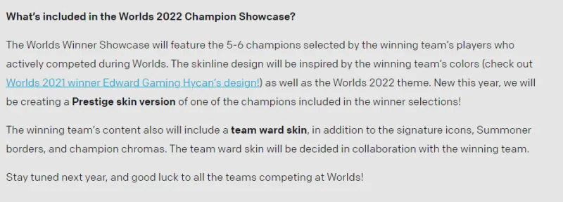 虎扑10月22日讯 拳头官方在今早发布一则公告,并在公告中透露2022年全球总决赛冠军战队将额外获得一个至臻冠军皮肤。