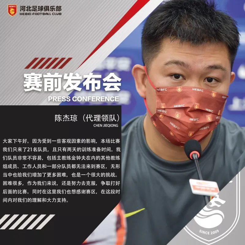 虎扑10月23日讯 中超联赛第19轮,河北队对阵深圳队,受客观因素影响,包括主教练金钟夫在内的大部分教练团队成员、领队郎征、部分队员和工作人员均未能如期抵达海口参加本场比赛。河北队代理领队陈杰琼携球员高华泽出席了赛前新闻发布会。