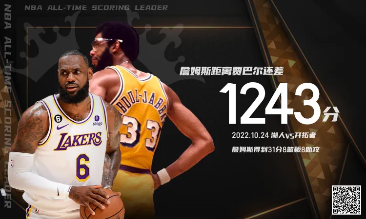 本场惜败开拓者的比赛结束后,詹姆斯与贾巴尔还差1243分。
