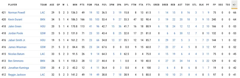 本场过后,杜兰特在本赛季至今的5场比赛里合计正负值为-64,排在联盟倒数第二位,仅比快船前锋诺曼-鲍威尔的-66高。