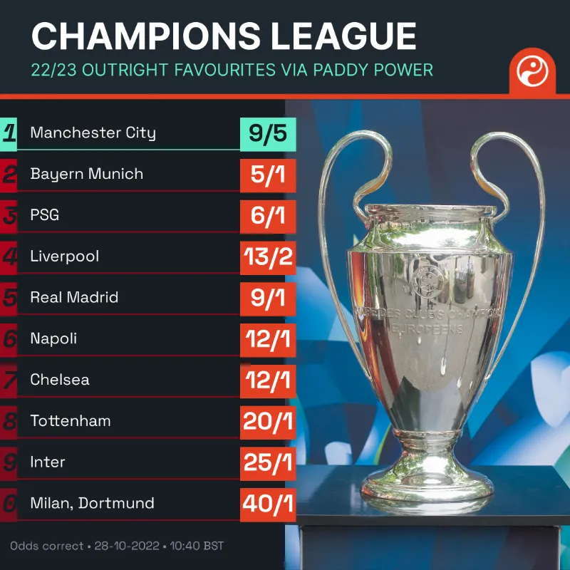 虎扑10月29日讯 知名足球数据网站Squawka和博彩网站Paddy Power发布了最新的欧冠冠军赔率,曼城以9/5的赔率遥遥领先,具体榜单如下: