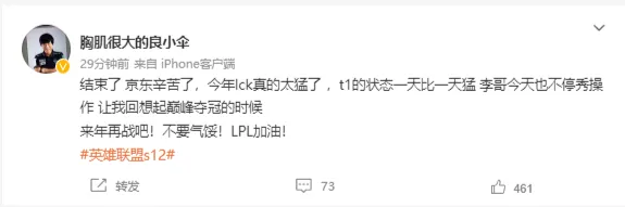 小伞:结束了 京东辛苦了,今年lck真的太猛了 ,t1的状态一天比一天猛 李哥今天也不停秀操作 让我回想起巅峰夺冠的时候