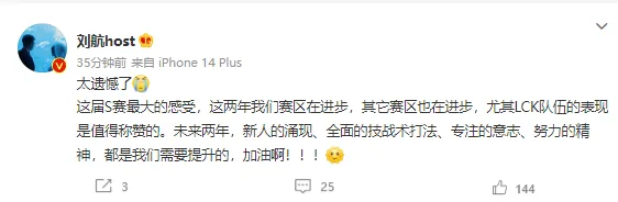 这届S赛最大的感受,这两年我们赛区在进步,其它赛区也在进步,尤其LCK队伍的表现是值得称赞的。未来两年,新人的涌现、全面的技战术打法、专注的意志、努力的精神,都是我们需要提升的,加油啊!!!