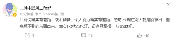 前WE\EDG辅助Fzzf:只能说确实有差距,战术储备,个人能力确实有差距,感觉lck现在别人就是能拿出一些意想不到的东西出来,确实skt状态也好,很有冠军相!恭喜skt吧。