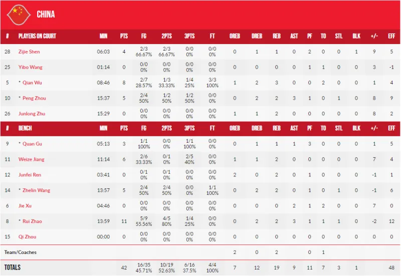 赵睿11分3助攻,吴前8分3篮板,姜伟泽6分,周鹏5分3助攻,王哲林5分2篮板。