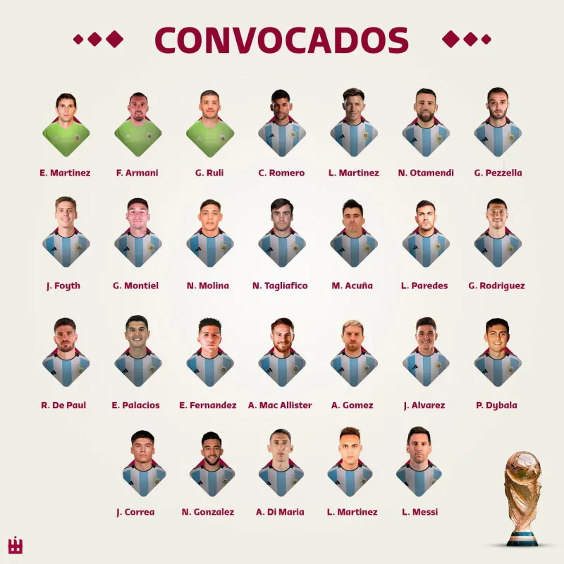 阿根廷世界杯26人大名单:(德转现总身价:6.332亿欧)