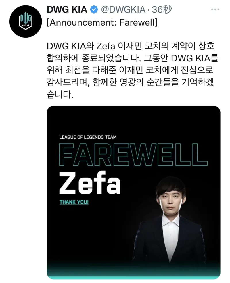 虎扑11月16日讯 DK官宣:经双方商议后,我们终止和Daeny监督、Zefa教练的合同,具体内容翻译如下: