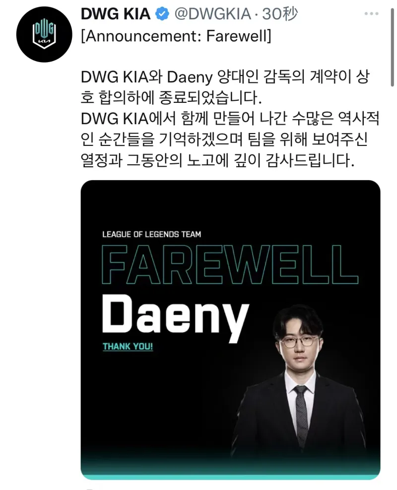 “双方商议后,DK终止Daeny监督的合同。DK将铭记一同创造的非常多的历史性的瞬间,非常感谢他为队伍展现的热情和这段时间的辛劳。”