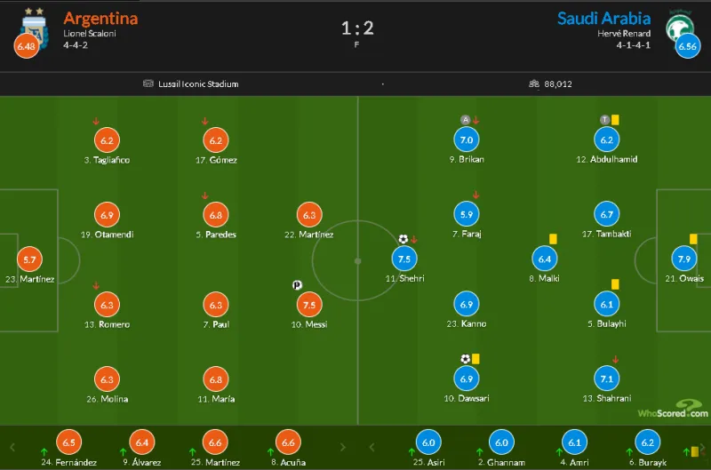 虎扑11月22日讯 世界杯小组赛C组第一轮,阿根廷对阵沙特。梅西点射首开纪录,劳塔罗两度越位破门被吹。下半场谢赫里、多萨里接连破门完成逆转,阿根廷1-2沙特遭遇开门黑。