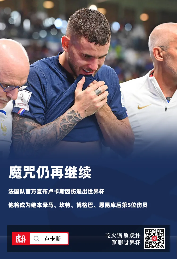 虎扑11月23日讯 据法国队官推不久前发布的消息,卢卡斯-埃尔南德斯因伤退出本届世界杯。
