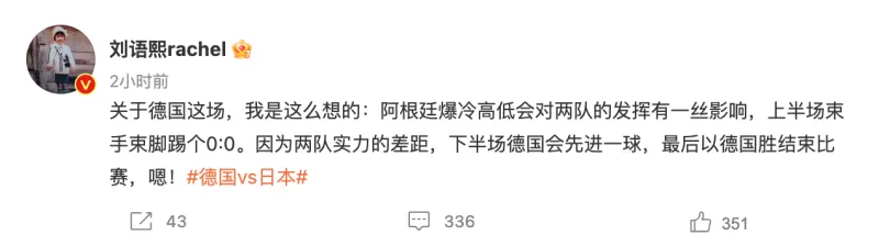 虎扑11月23日讯 刚刚结束的世界杯小组赛,德国队爆冷1-2遭到日本队逆转。在赛前,刘语熙曾在微博上表示,看好德国取胜。
