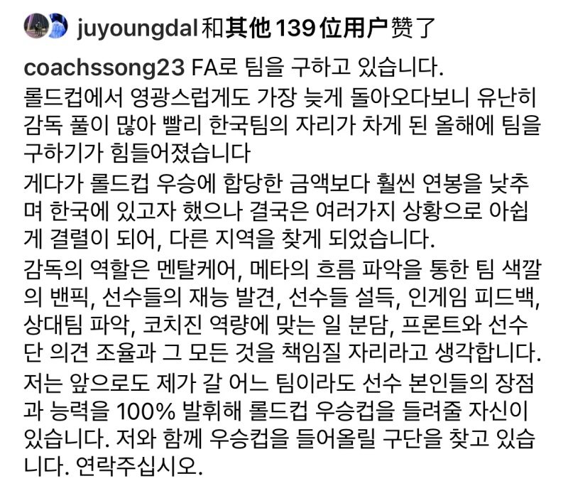 虎扑11月24日讯 前DRX冠军监督Ssong更新ins,原文翻译如下: