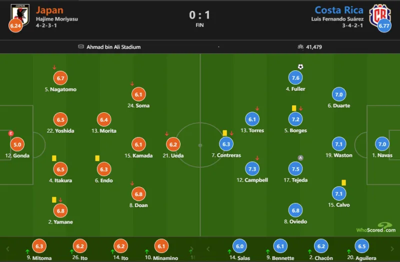 虎扑11月27日讯 2022年世界杯小组赛E组第二轮,日本对阵哥斯达黎加。上半场比赛,双方均未能创造出破门良机。下半场比赛,相马勇纪任意球直接射门稍稍打高,富勒兜射上角破门打入制胜球。最终全场比赛结束,哥斯达黎加1-0战胜日本,迎来球队本届世界杯首场胜利。