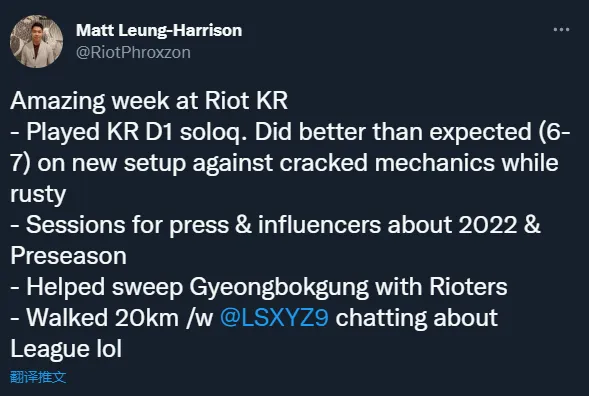 虎扑11月28日讯 英雄联盟召唤师峡谷游戏玩法的首席负责人Phroxzon在个人推特上分享了去韩国拳头的一周见闻,大意如下: