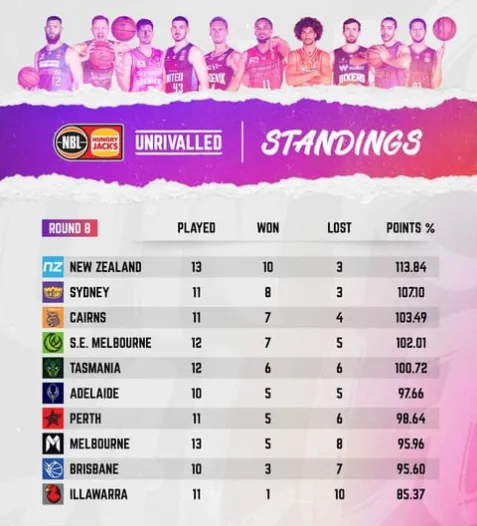 新西兰破坏者10胜3负排名第1,悉尼国王队8胜3负排名第2,凯恩斯太攀蛇7胜3负排名第3,东南东南墨尔本凤凰队7胜5负排名第4。