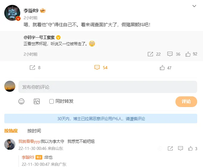 随后媒体人李璇转发这则消息并表示:“嗯,就看他‘守’得住自己不。看来调查面扩大了,假赌黑颤抖吧!”