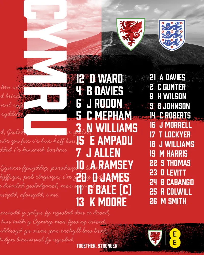 威尔士首发:12-丹尼-沃德、3-内科-威廉姆斯、4-本-戴维斯、5-梅菲姆、6-罗登、7-乔-阿伦、10-拉姆塞、11-贝尔、13-摩尔、15-阿姆帕杜、20-丹尼尔-詹姆斯
