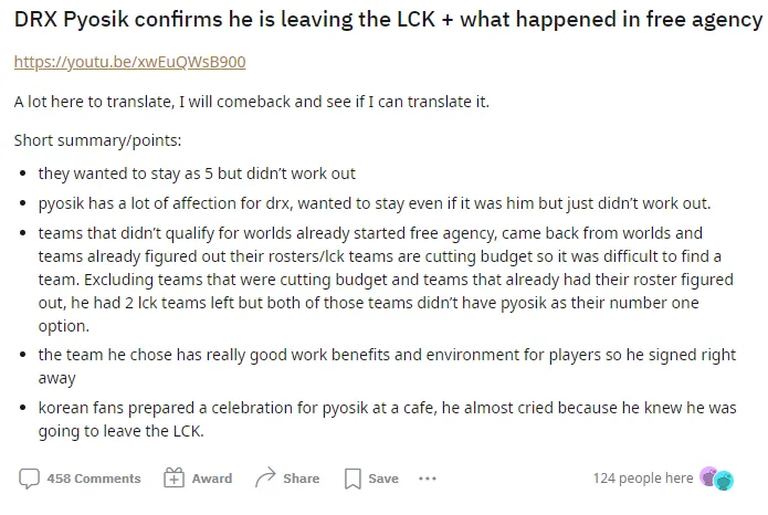 没有打进S12的队伍早就开始探索自由市场了。等DRX打完世界赛回来之后各队阵容基本都确定了,并且LCK队伍大多都在削减预算。所以Pyosik在LCK很难找到队伍。排除阵容已经确定的和削减预算的队伍,Pyosik就只剩下两支队伍可以去。但是这两只队伍的首选都不是Pyosik。