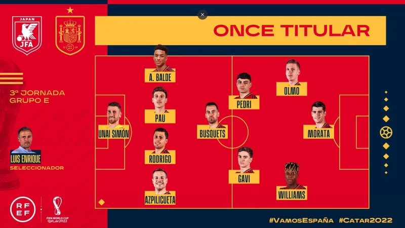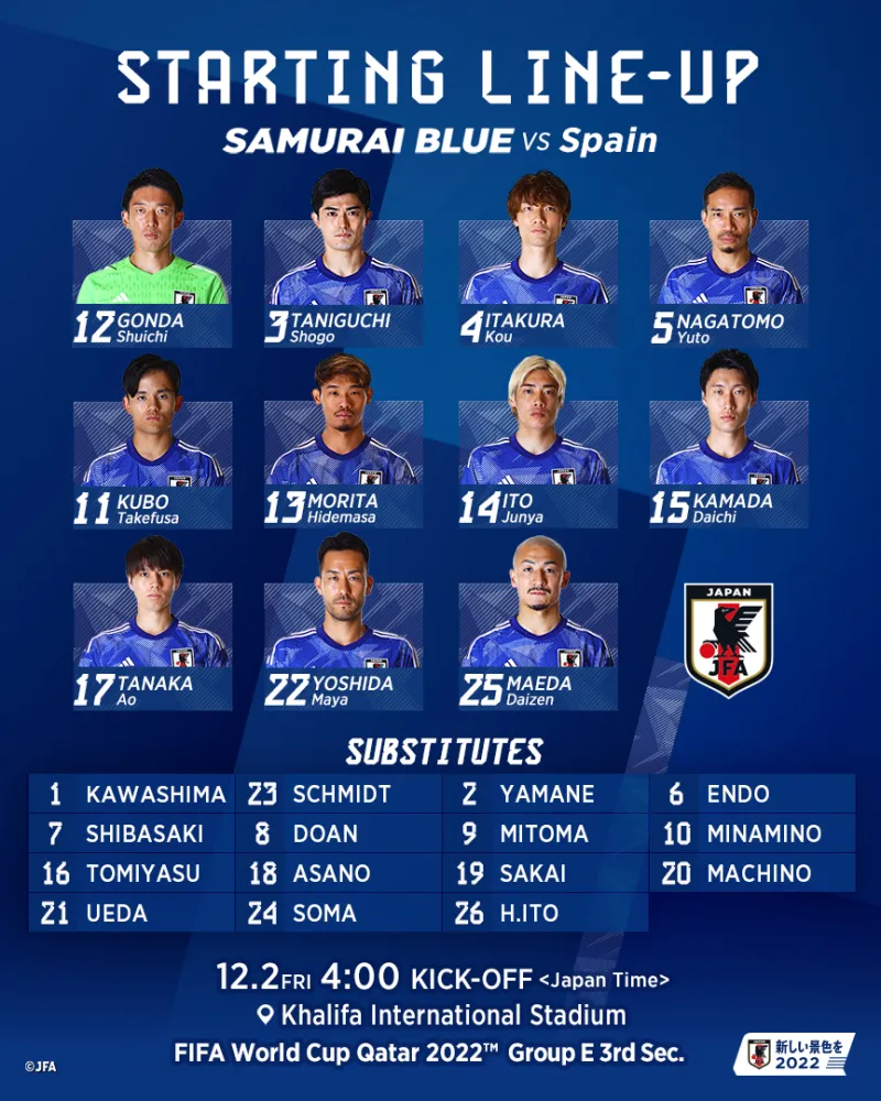 虎扑12月02日讯 北京时间今天凌晨三点,世界杯小组赛F组迎来焦点战:日本对阵西班牙。赛前,双方公布了首发阵容。