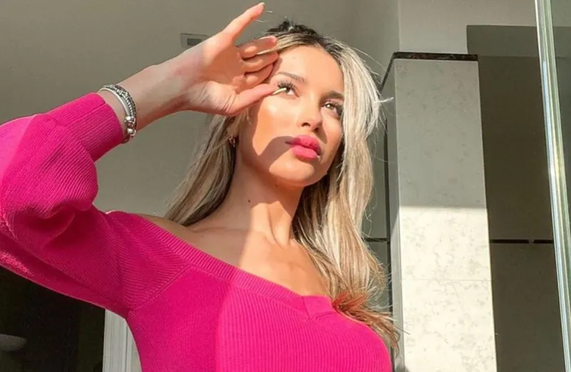 Agustina Gandolfo身穿男友劳塔罗的22号阿根廷球衣,搭配一条粉色的裤子以及一个粉色的包。