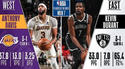 虎扑12月06日讯 今日联盟官方公布上周东西部周最佳球员,篮网前锋凯文-杜兰特和湖人前锋安东尼-戴维斯分别当选。