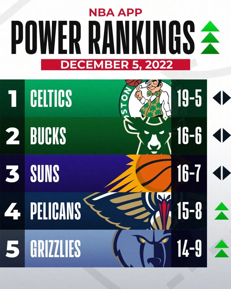 虎扑12月06日讯 NBA官方公布了最新实力榜排名,凯尔特人继续排名第一,雄鹿太阳分居第二、第三,鹈鹕升至第4,勇士第11,篮网第15,湖人第19。