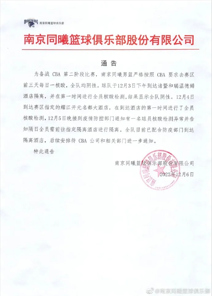 为备战CBA 第二阶段比赛,南京同曦男篮严格按照CBA要求去赛区前三天每日一核酸,全队均阴性。球队于12月3日下午到达诸暨和瑞温德姆酒店隔离,并在第一时间进行全员核酸检测,结果显示全队阴性。12月4日到达赛区指定的耀江开元名都大酒店,在到达酒店的第一时问进行了全员核酸检测,12月5日晚接到疫情防控部门通知有一名球员核酸检测异常并告知隔日全员需前往指定隔离酒店进行隔离。全队目前已配合防疫部门到达隔离酒店,后续安排待CBA公司和相关部门进一步通知。