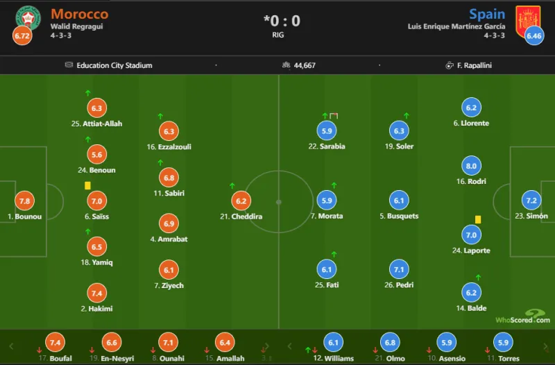 摩洛哥首发:1-布努、2-阿什拉夫、3-马兹拉维(82' 25-阿提亚特-阿拉尔)、5-阿格德(84' 18-亚米克)、6-赛斯、4-阿姆拉巴特、8-奥纳西(119' 24-巴德尔-贝农)、15-塞利姆-阿马拉(82' 21-切迪拉)、7-齐耶赫、17-布法尔(65' 16-阿布德)、19-恩内斯里(82' 11-萨比里)