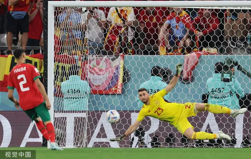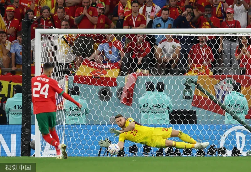 点球大战第2轮,齐耶赫命中,索莱尔罚失,西班牙0-2摩洛哥