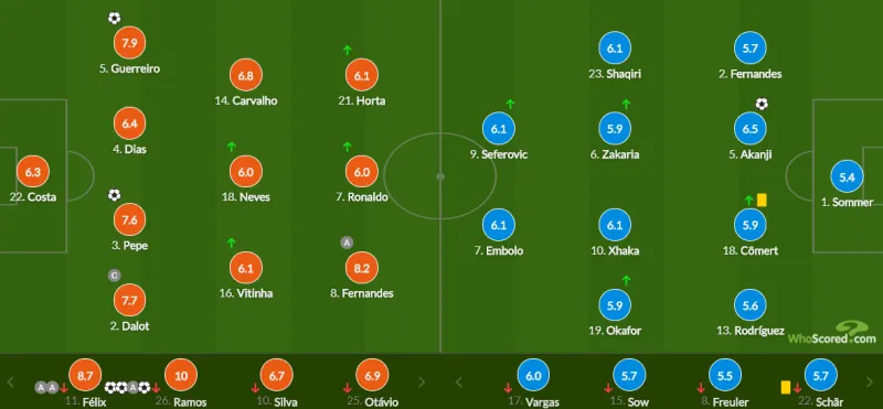 瑞士首发:索默、费尔南德斯、沙尔、阿坎吉、里卡多-罗德里格斯、弗鲁勒尔、扎卡、沙奇里、索乌、巴尔加斯、恩博洛;