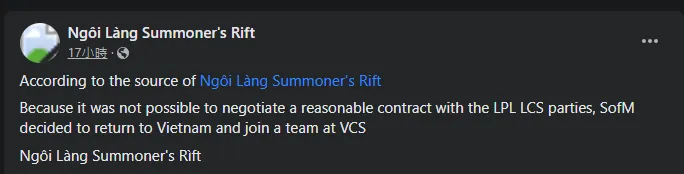 虎扑12月06日讯 据越南媒体爆料,WBG打野选手SofM由于未能和LPL以及LCS赛区队伍未能在合同问题上协商一致,SofM将在下赛季回到越南赛区。