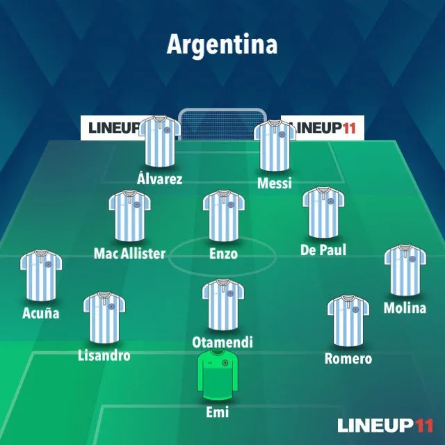 阿根廷首发:23-迪布-马丁内斯、26-莫利纳、13-库蒂-罗梅罗、19-奥塔门迪、25-利桑德罗-马丁内斯、8-阿库尼亚、7-德保罗、24-恩佐-费尔南德斯、20-麦卡利斯特、10-梅西、9-胡里安-阿尔瓦雷斯