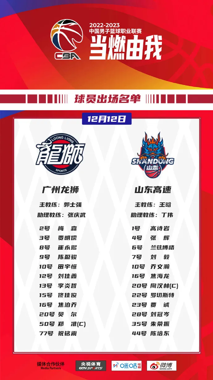 虎扑12月12日讯 2022-23赛季CBA常规赛第12轮,广州队对阵山东队。赛前官方发布双方出战大名单。