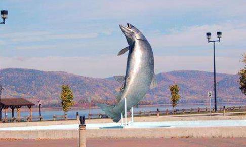 三文鱼雕塑坐落于新不伦瑞克省坎贝尔顿的市中心,关于这个巨大的雕像还是一个故事。1997年,加拿大渔民在靠近坎贝尔顿的米拉米奇湾(Miramichi Bay)捕捉到了一条长为8.5米、重为1吨的三文鱼,这条鱼是世界上迄今为止捕捉到的最大的一条三文鱼。1998年,人们按照原三文鱼的尺寸大小建造了这座三文鱼雕像。三文鱼雕像是直立的,鱼头朝上,鱼的尾巴自然弯翘,鱼鳞在阳光下会闪闪发光,形态栩栩如生。据说雕像的布置也反映了三文鱼的生活习性,下面是一个大水池寓意大海,好似有一条鲜活的三文鱼跃出水面。