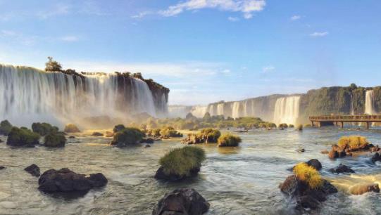 伊瓜苏国家公园(Iguazu National Park)处于玄武岩地带,高80米,直径2700米,跨越阿根廷和巴西国界,世界上最壮观的瀑布之一就位于这个地区的中心。许多小瀑布成片排开,层叠而下,激起巨大的水花。周围生长着200多种维管植物的亚热带雨林,是南美洲有代表性的野生动物貘,食蚁动物,吼猴,虎猫,美洲虎和大鳄鱼的快乐家园。被誉为“南美第一奇观”的伊瓜苏瀑布是南美洲最大的瀑布,也是世界五大名瀑之一。