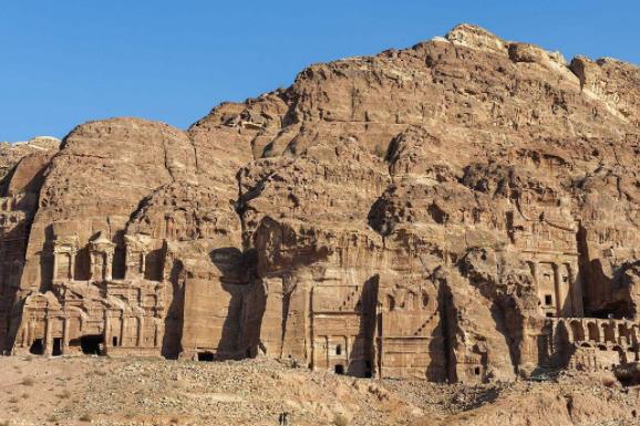 介绍:佩特拉古城里约有七百多个墓冢,而最著名的,要算是皇家墓冢群了,其中规模最大的是厄恩墓室Urn Tomb,墓室内呈正方形,高18米,长宽各20米,在其中说话,回声隆隆不绝。罗马人占领时期,下面增建了拱形建筑,设立了司法人员的办公室和监狱,当时是罗马帝国佩特拉行政区最高的司法机构所在地,所以后人称此地为“法院”。公元446年,又改为东正教堂。从厄恩墓室顺势向右,是皇族墓室、科林斯式墓室、宫殿墓室和六瓣花墓室。