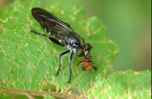 世界最大的苍蝇,拟食虫虻是从花朵中获取养分,但幼年拟食虫虻应该是捕食性的。英雄拟食虫虻的幼虫会栖息在切叶蚁的蚁群中或附近,并靠捕食蚂蚁,以及吃蚂蚁排泄物的昆虫幼虫为生。因为雌性会在蚁丘上产卵,所以只要占领蚁丘,雄性就意味着能够征服雌性。
