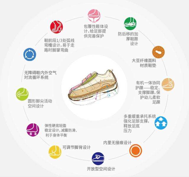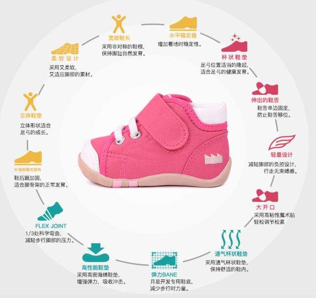 月星的学步鞋有四大核心机能:宽敞的鞋头、科学弯曲的外底、补强板型式结构和杯状鞋垫。