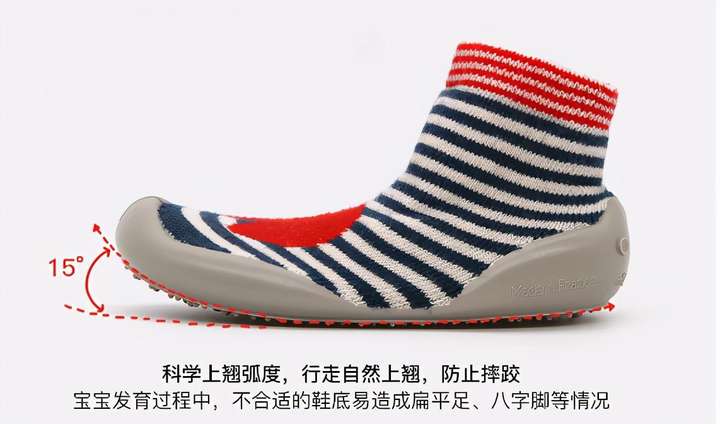 鞋头15度上翘,行走时自然上翘,防止宝宝摔跤。