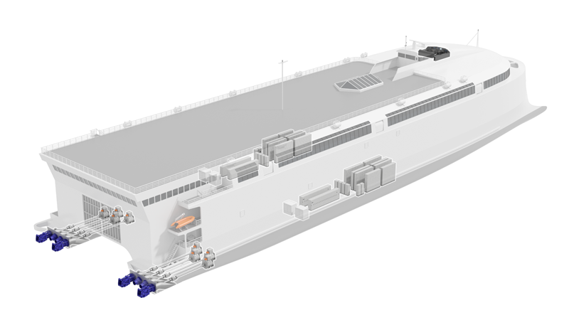 该项目的主要合作伙伴之一是瓦锡兰公司,这是一家在能源和海事行业享有盛誉的动力设备制造商。瓦锡兰公司将提供40兆瓦时的电池模块、8台电动机以及8台轴流式 WXJ1100喷射推进器。Buquebus公司将这艘船称为轻型双体RoPax(客滚船),目前,该船的叶轮和喷水推进装置已完成安装,推进系统与储能设备正运往塔斯马尼亚的组装基地。这艘渡轮内部的装修也在按计划进行,其内部将拥有世界上同类型船只中最大的免税购物甲板空间(2300平方米/25000平方英尺)。